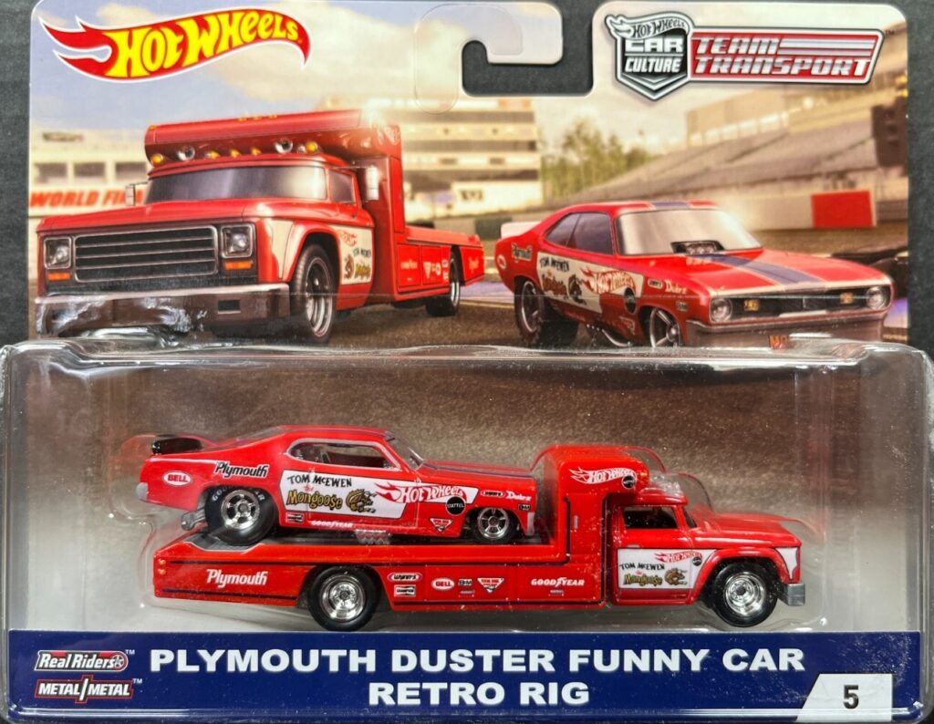 Hot Wheels Team Transport #5 – Plymouth Duster Funny Car & Retro Rig continues the drag racing theme within the Hot Wheels Team Transport. Featuring the aggressive Plymouth Duster Funny Car paired with the classic Retro Rig, this set highlights the golden era of American NHRA racing. The Duster Funny Car’s bold stance, colorful racing livery, and exaggerated proportions capture the essence of vintage drag culture. The Retro Rig complements it with a matching hauler design, making the set visually cohesive, nostalgic, and highly appealing for muscle car and drag racing collectors.