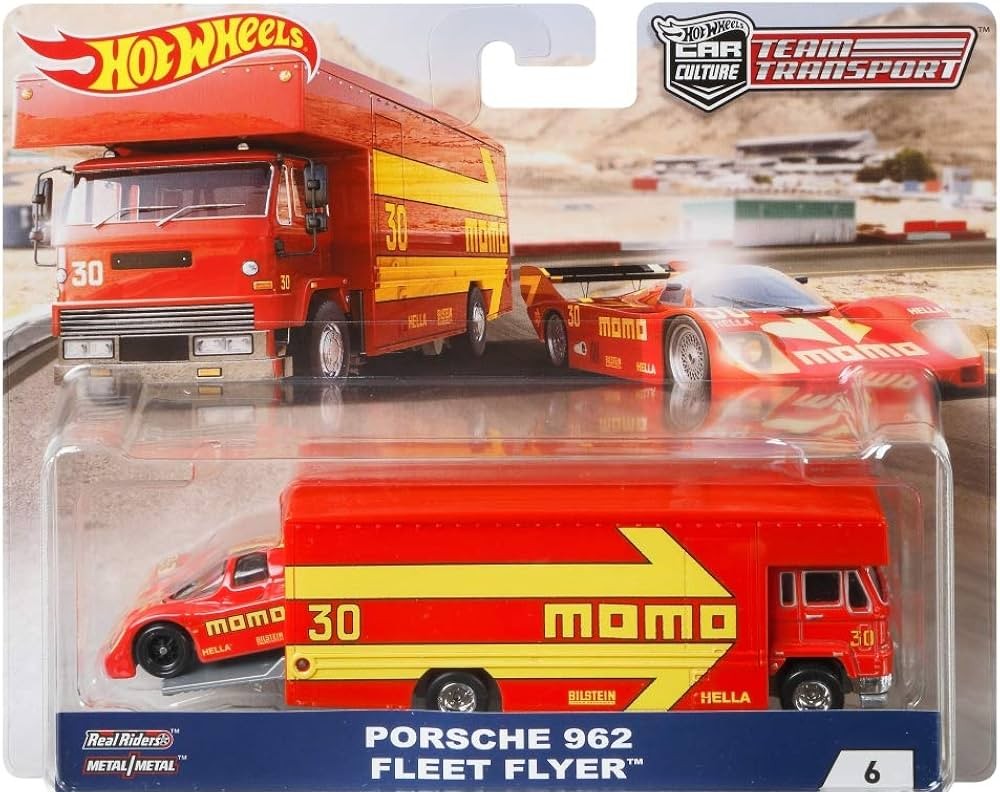 Hot Wheels Team Transport #6 – Porsche 962 & Fleet Flyer brings endurance racing heritage to the Hot Wheels Team Transport. Featuring the legendary Porsche 962 paired with the sleek Fleet Flyer, this set reflects the golden era of Le Mans–style racing. The Porsche 962’s aerodynamic design and iconic racing livery make it a standout among collectors. The Fleet Flyer complements it with a low-profile, race-focused hauler design. Together, they create a visually cohesive and highly desirable set, especially for fans of endurance racing and classic Porsche motorsport history.