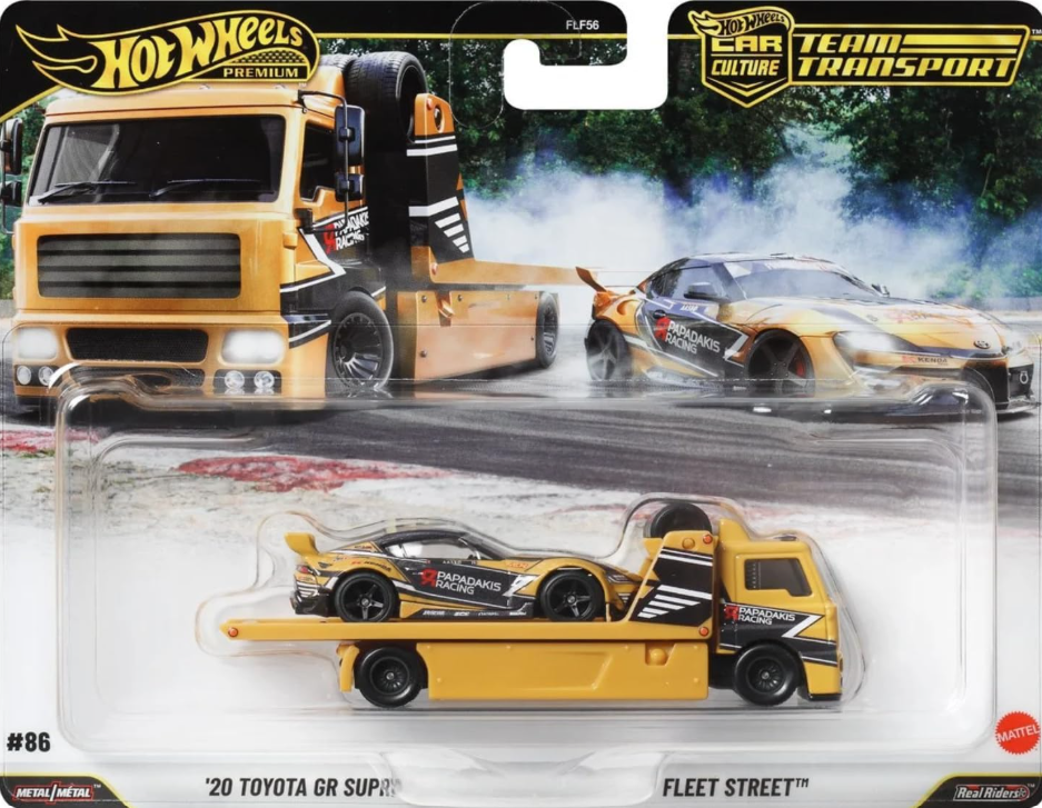 Hot Wheels Team Transport #86 pairs the modern performance of the ’20 Toyota GR Supra with the versatile Fleet Street hauler, both finished in the striking yellow and black Papadakis Racing livery. This set is a standout for JDM enthusiasts, celebrating one of the most successful teams in drift racing history. As a premium release, both models feature Metal/Metal construction and Real Riders rubber tires for a heavy, authentic feel. The Supra’s aggressive aero and wide-body styling are perfectly complemented by the Fleet Street’s clean, functional lines. It’s an essential addition for collectors focusing on contemporary racing heritage and high-fidelity Japanese sports cars.