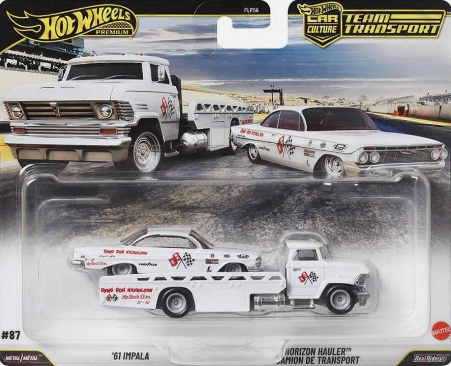 Hot Wheels Team Transport #87 is a masterclass in drag racing history, featuring the ’61 Chevrolet Impala paired with the Horizon Hauler. For collectors, the draw is the iconic “Dyno Don” Nicholson livery, a pristine white finish adorned with period-correct “Mr. Stock Elim.” graphics and checkered flag accents. This set perfectly captures the golden era of American Super Stock racing. Both models boast premium Metal/Metal construction and Real Riders tires, with the Impala’s sleek lines contrasting beautifully against the modern-custom Horizon Hauler. It’s a historically significant addition that bridges the gap between vintage speed and contemporary Hot Wheels design.