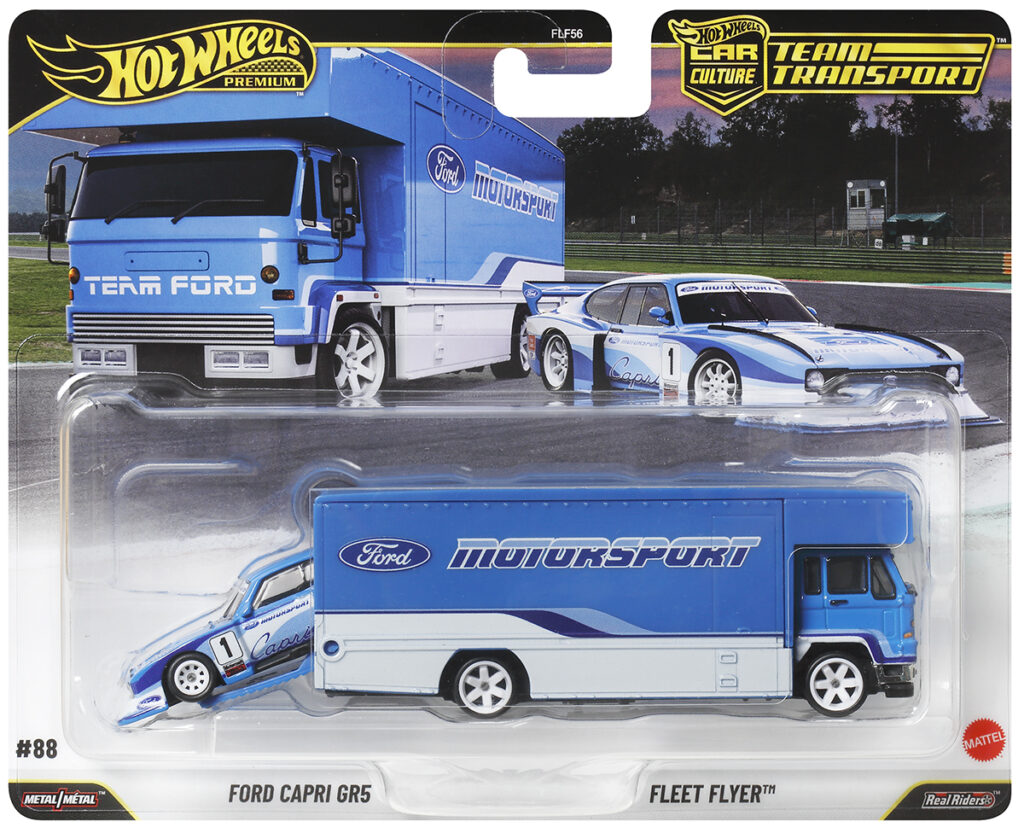 Hot Wheels Team Transport #88 features the aggressive ’77 Ford Capri GR5 alongside the classic Fleet Flyer hauler. Finished in a nostalgic Ford Motorsport blue and white racing livery, this set is a tribute to the “Silhouette” era of Group 5 touring car racing. For collectors, the Capri is a standout, showcasing extreme wide-body fenders and massive aero components that define 1970s track legends. It’s a vital piece for those documenting European racing history and the evolution of Ford’s motorsport dominance.